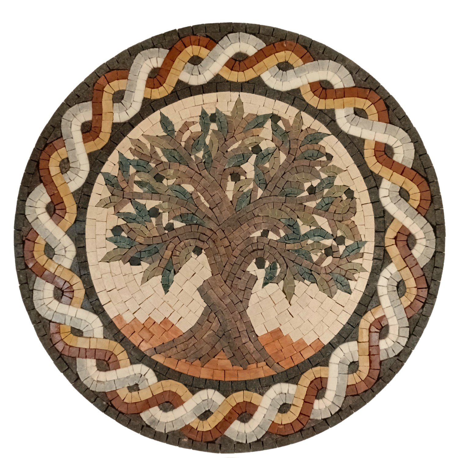 A handcrafted mosaic of an olive tree, measuring 40 × 40 cm. Customizable size, eco-friendly, mounted on a wooden base, and free worldwide shipping.