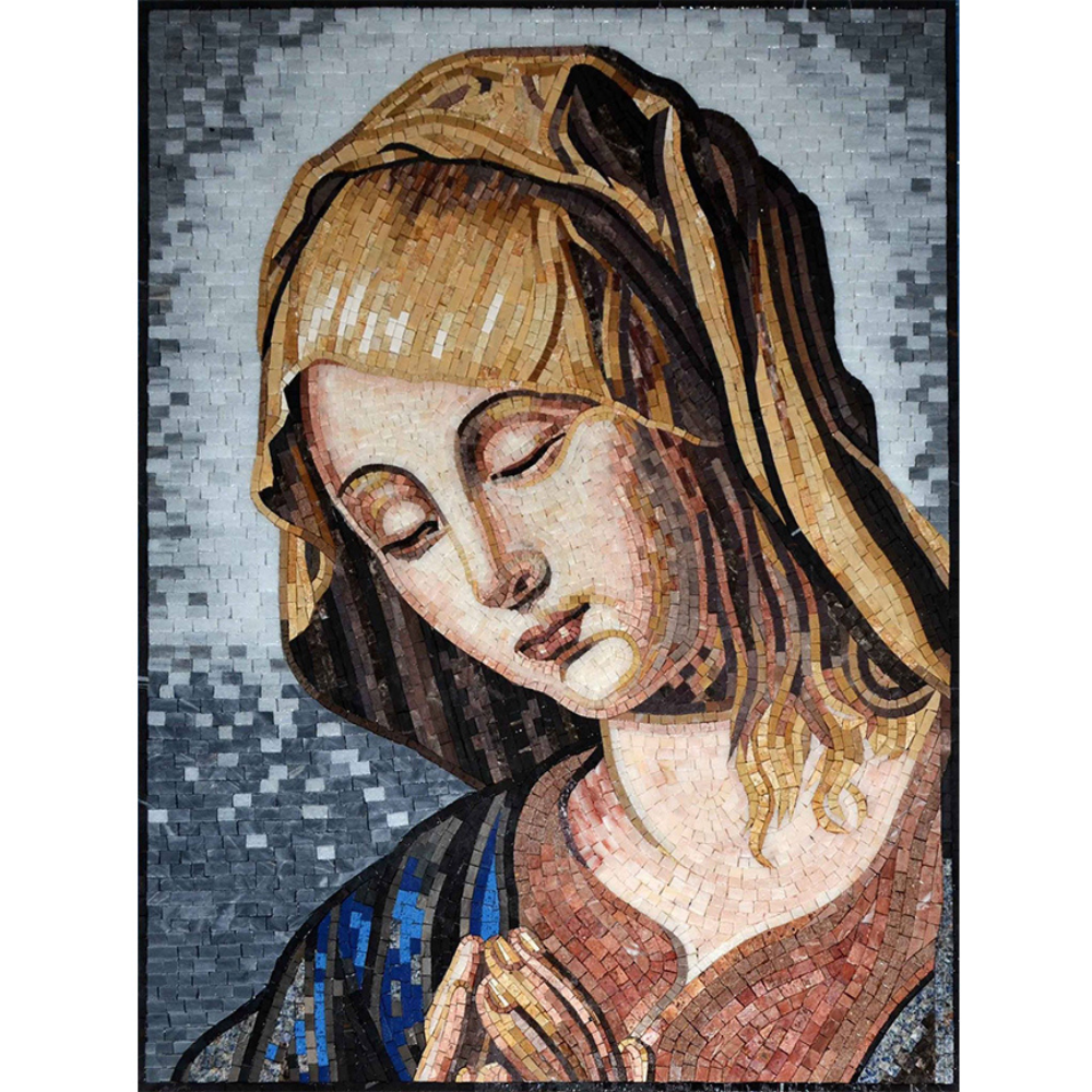 Handmade Virgin Mary Mosaic Artwork crafted from natural marble, ideal for homes and churches, offering a unique blend of spiritual beauty and timeless elegance.
